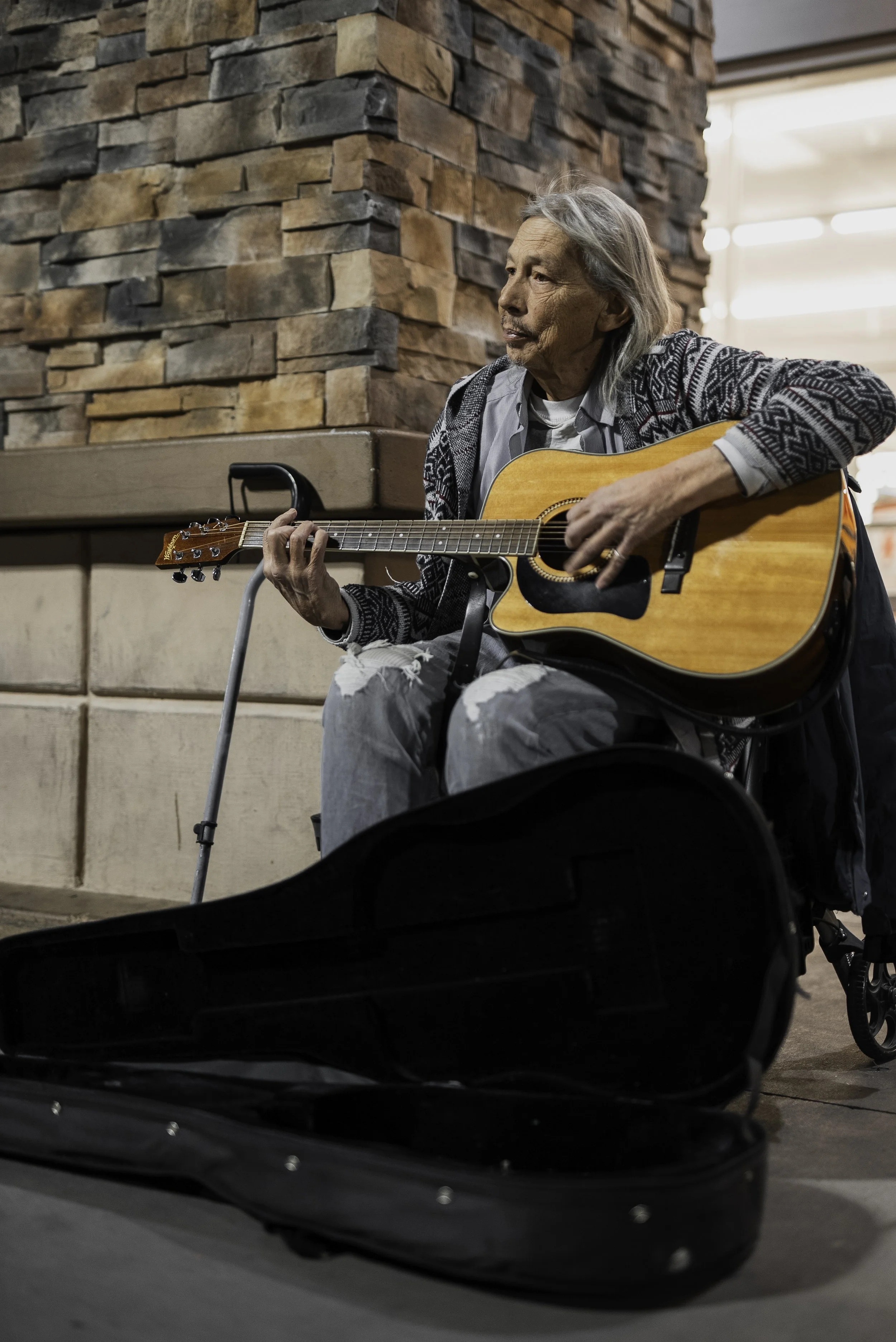 I’ve seen Scott many times outside my local Smith’s. He sits in a wheelchair, a cane nearby, a guitar resting close, and a kind, open face that somehow feels familiar even if you’ve never spoken. I’ve walked past him more times than I can count on my way into the grocery store. I’ve heard his music drifting through the parking lot. Folk rock. Songs I’ve known my entire life. Songs that stretch across decades and still seem to belong to everyone.